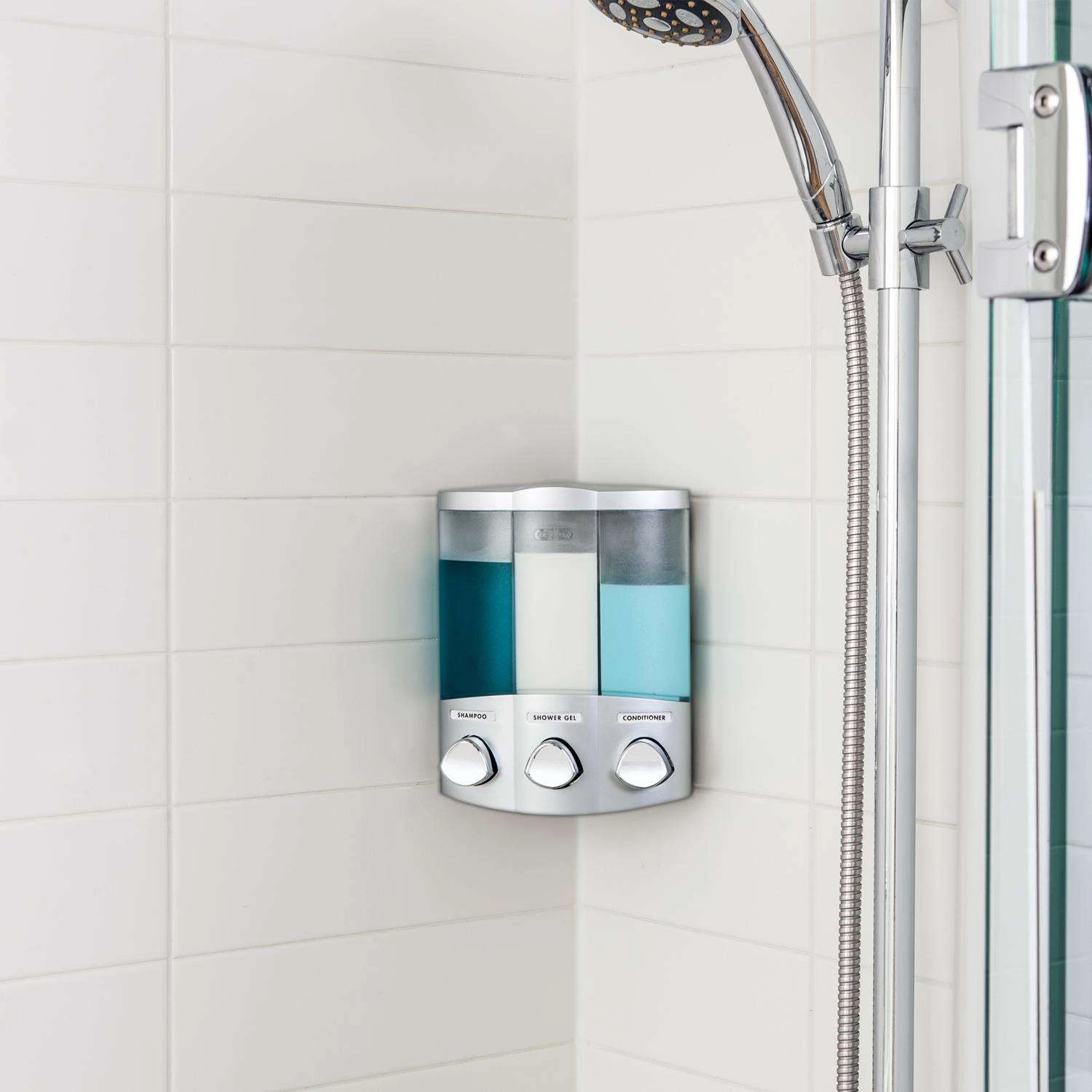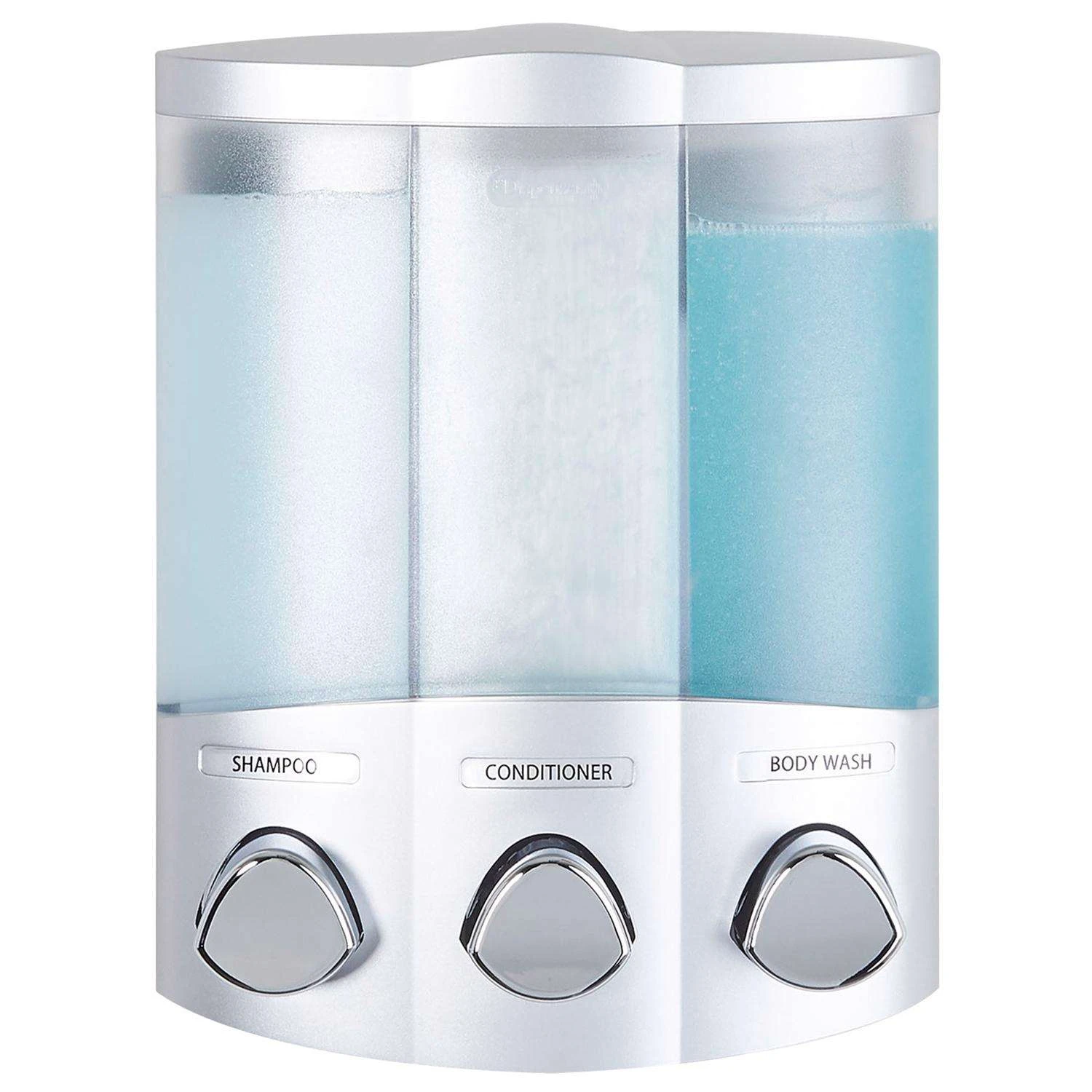 The Trio Shower Dispenser is a beautiful solution to the messy problem of bottle clutter. This wall-mounted soap dispenser is easy to install and easy to use. It is the perfect shower soap dispenser whether you install it flat on the wall or in a corner to make use of un-usable shower space. The Trio Shower Dispenser will easily store your favorite shampoo, conditioner and body wash. Liquid soap dispenser eliminates shower bottle clutter and container lifts off the wall for easy cleaning and re-filling Wall mounted soap dispenser can be mounted either in the corner or flat on a wall Smooth, reliable dispenser pumps Installs in minutes without tools, using waterproof silicone adhesive and 2-way tape Housing constructed from durable, water-resistant