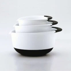 Non-slip bottoms ensure the Mixing Bowls stay put on countertops and feature a soft, comfortable handle that’s easy to grip. The wide lip and spout make it easy to pour ingredients. Available in 1.5 quart, 3 quart and 5 quart sizes and in a 3 piece set that nests for convenient storage. 5-quart size is designed for doubling recipes and mixing larger quantities OXO Good Grips Mixing Bowls are great for whisking eggs, mixing batter and making marinades The bowl feature a soft, comfortable, non-slip handle that is easy to grip A non-slip bottom stabilizes the bowl while you perform mixing tasks and a wide lip and pouring spout make it easier to pour ingredients Dishwasher Safe BPA Free
